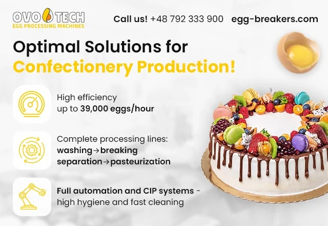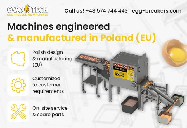 OVO-TECH is an experienced manufacturer of egg processing machinery for the food industry in Poland and international markets. For over 20 years, we have been designing and manufacturing modern egg breakers, egg white and yolk separators, centrifuges, filtration systems, washers, and UV-C disinfection devices. Our technologies support confectioneries, bakeries, pasta producers, catering companies, the HoReCa sector, and processing plants in automating and optimizing production processes. We offer comprehensive production lines for fresh and pasteurized egg production, tailored to individual customer needs.
